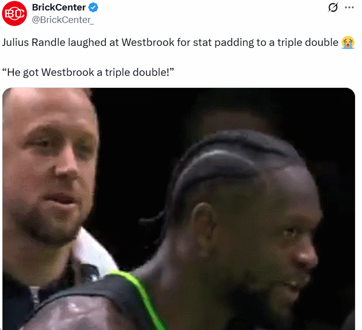 赛后美媒BrickCenter通过唇语解读兰德尔对着迪文说的话是“He got a Westbrook triple double(他让威少拿到了三双。)”